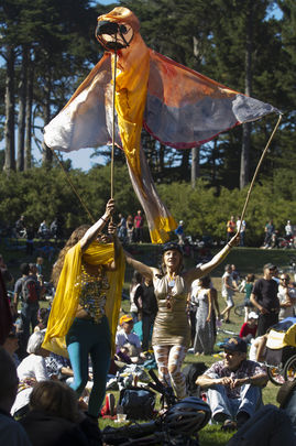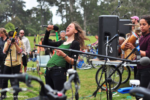 Free and all-ages, Bicycle Music Festival consisted of 3 sequential venues that unfolded like a delightful treasure hunt: beginning in the morning in Golden Gate Park with a stationary venue that featured a half-dozen bands representing a wide cross section of Bay Area music, from salsa, to square dance. Then around lunchtime the entire festival would pick up: bands, roadies, and audience, and load up onto bicycle trailers and cargo bicycles, pedaling across town together to our Night Venue in a spectacle called "LiveOnBike". This cross-city pilgrimage/parade featured live performances from bands perched atop a bicycle-drawn stage, playing to a rolling audience that would stretch for blocks. The parade would then arrive at our Night venue (stationary) where a half-dozen more bands would play until everyone was reduced to an exhausted pile of smiles.