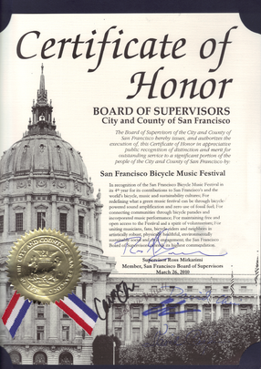 The award-winning Bicycle Music Festival in San Francisco—the world's largest pedal-powered music festival—took place annually from 2007-2015. Co-founded and co-produced by myself and my friend Paul Freedman (Rock the Bike), Bicycle Music Festival was profiled by press outlets as diverse as Treehugger and Scientific American; heralded as "iconic" by NPR, lauded as "the best bike fest" by Outside Magazine, and awarded The City of San Francisco's "Certificate of Honor" for "redefining what a green music festival can be."