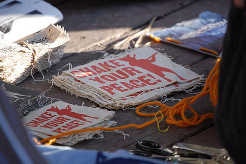 Since 2005 SHAKE YOUR PEACE! has experimented with touring by bicycle (6 tours and counting) and by foot (3 tours and counting), and amplifying concerts with a bicycle-powered sound system, pedaled by volunteers from the audience.